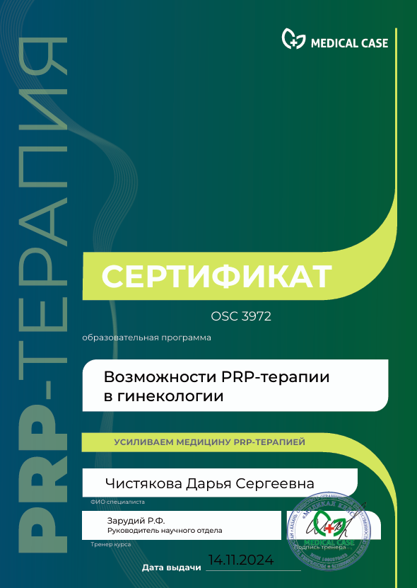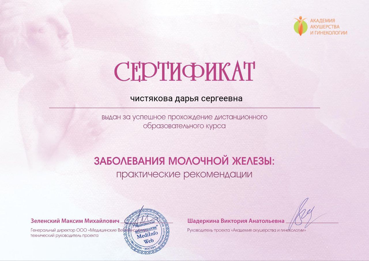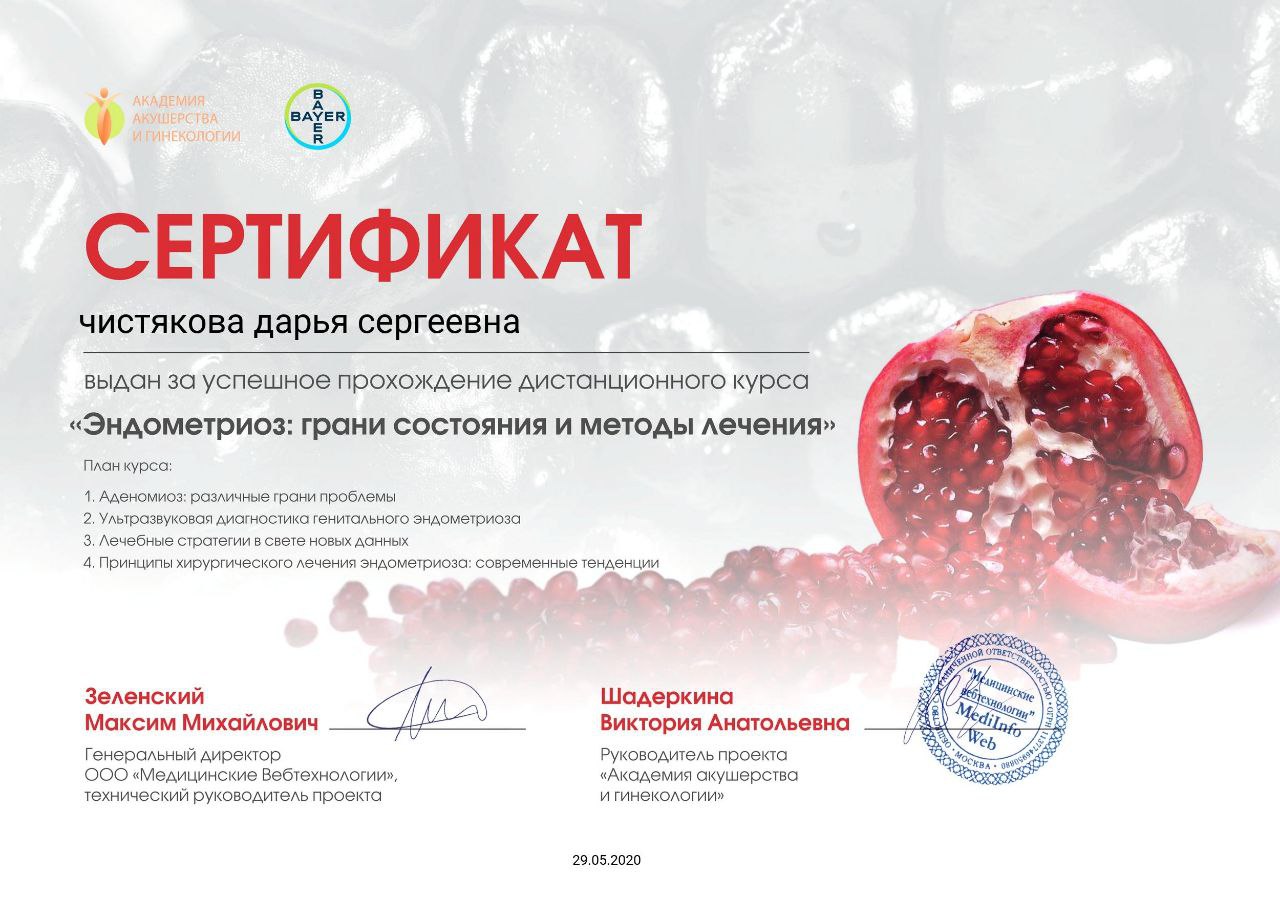 Защитила кандидатскую диссертацию на тему «Роль овариальной недостаточности в патогенезе невынашивания беременности» (2009 год).