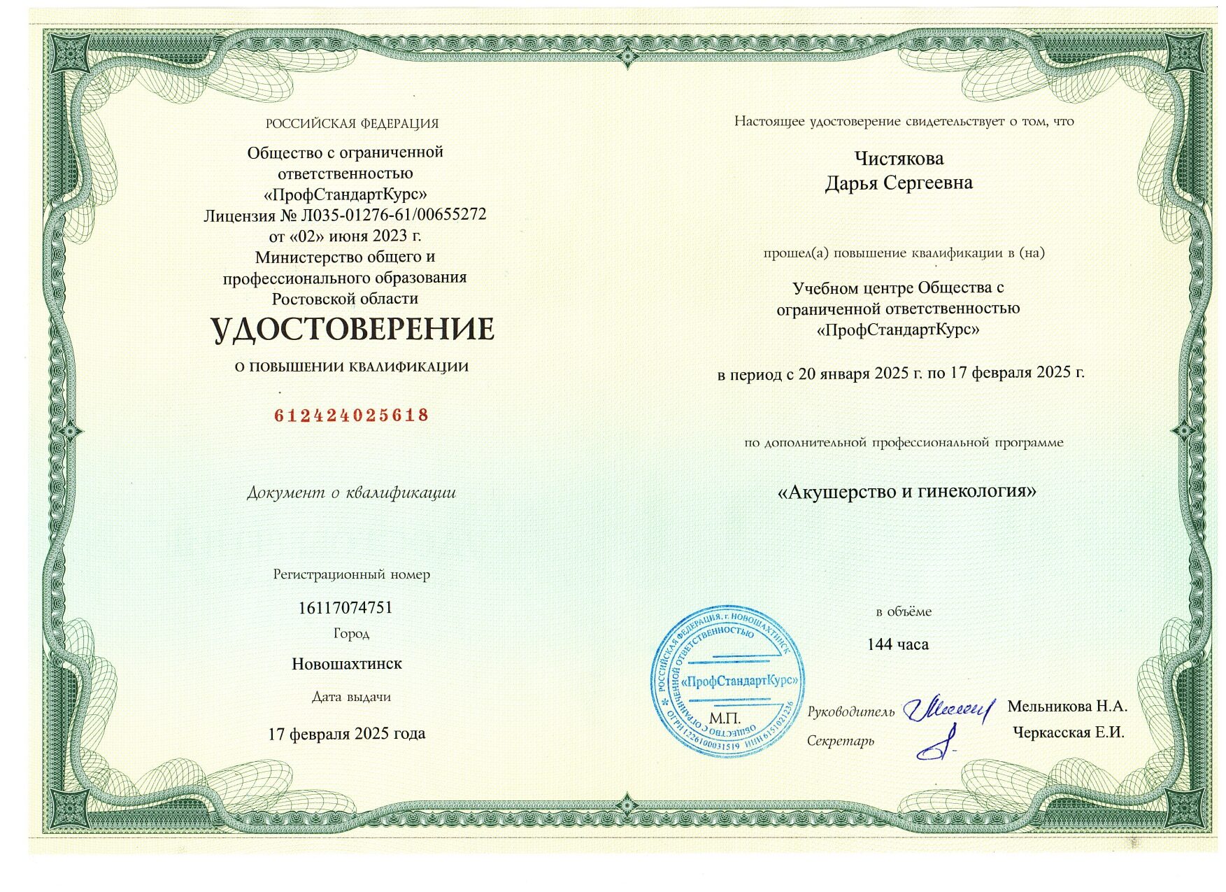 Стаж работы по специальности – 19 лет.