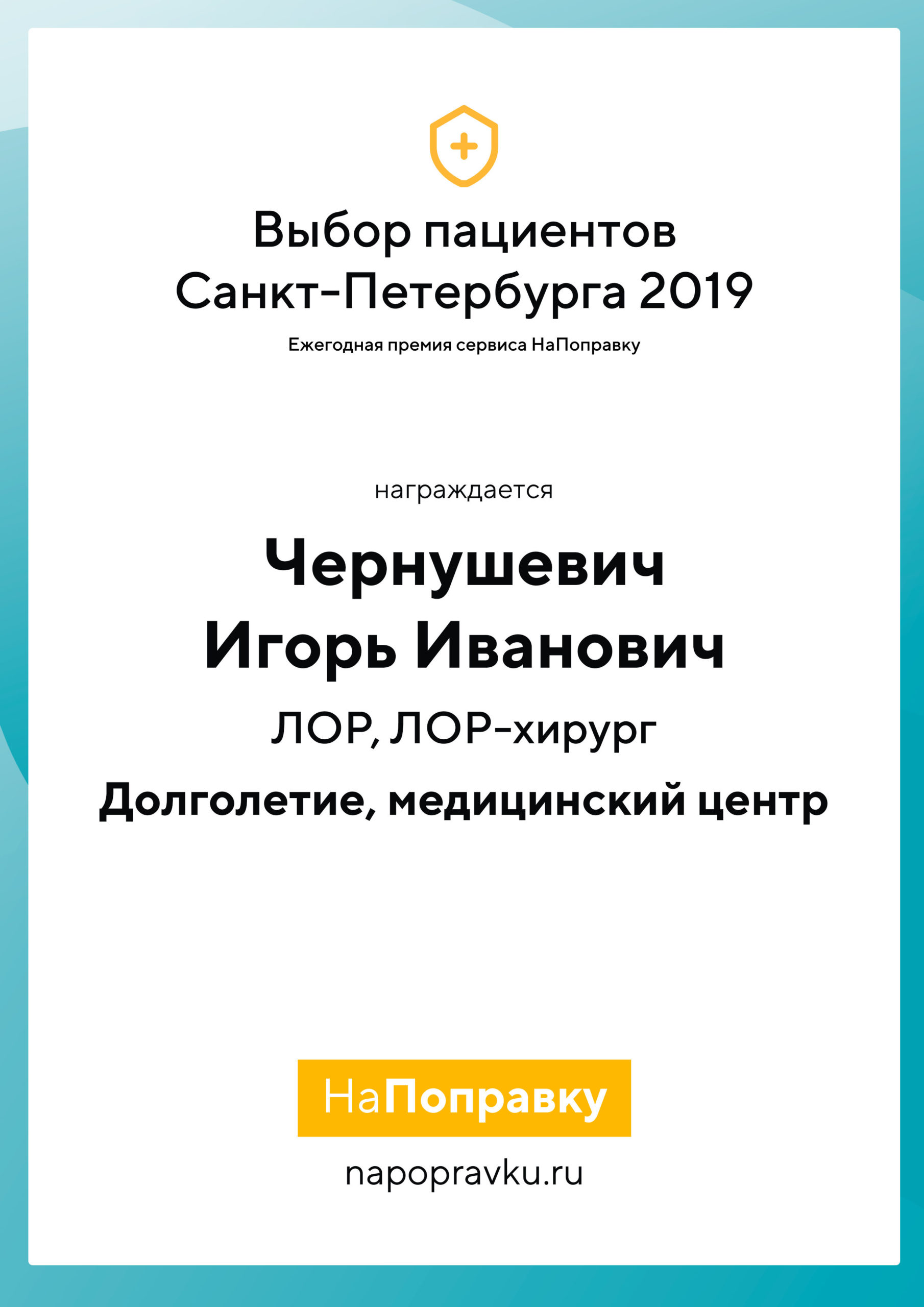 Чернушевич Игорь Иванович: врач оториноларинголог, запись на прием, цены в клинике «Долголетие» в СПБ