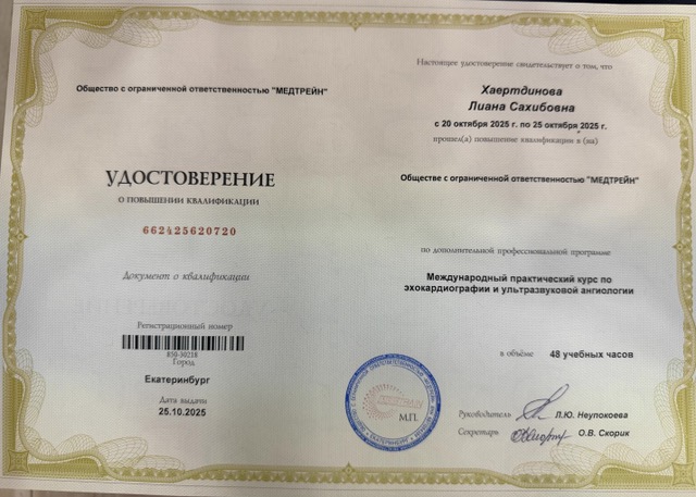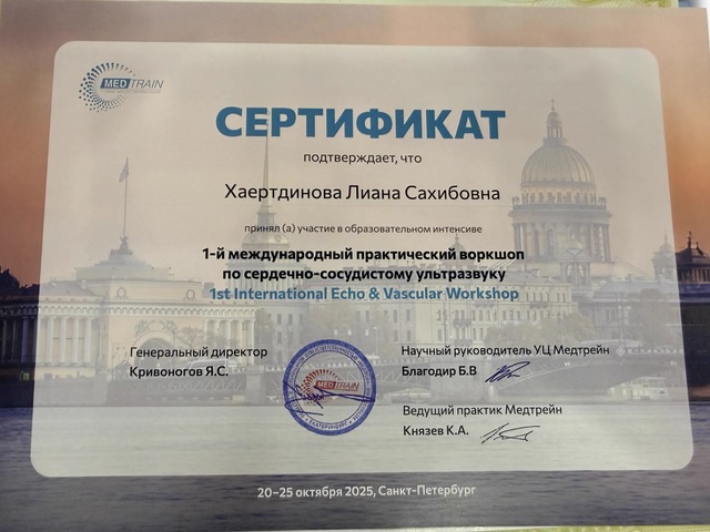 - 2025 г. Международный практический курс по эхокардиографии и ультразвуковой ангиологии.