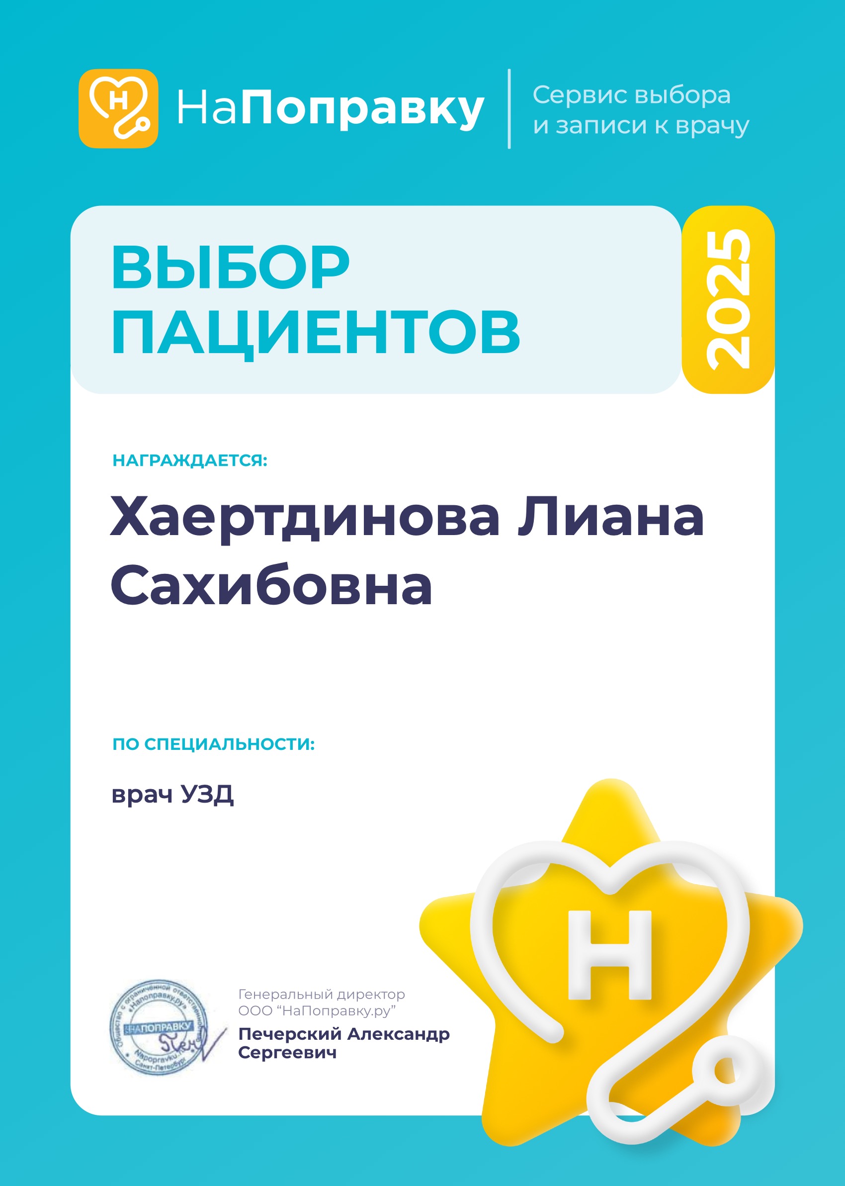 - Победитель конкурса «Лучший врач года» 2002 г, Саратов. В полном объеме ведет диагностический прием по профилю ультразвуковая диагностика. Регулярно проходит курсы повышения квалификации, очные стажировки у ведущих специалистов России, дополнительные обучающие программы, посещает отечественные образовательные конференции.